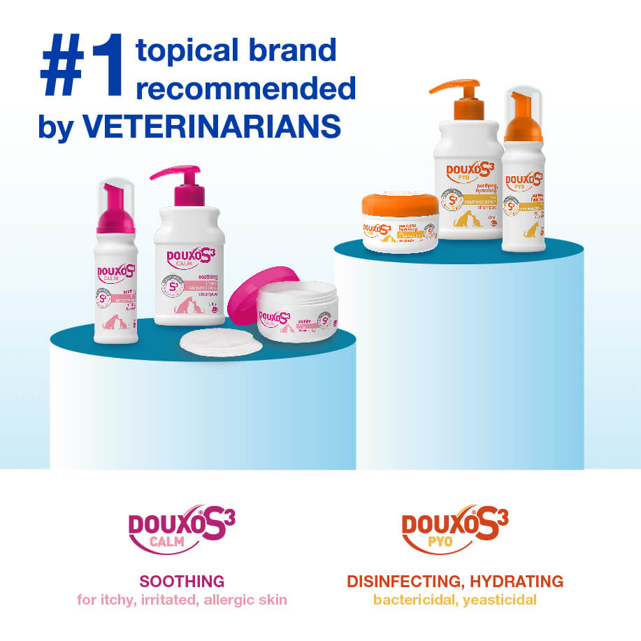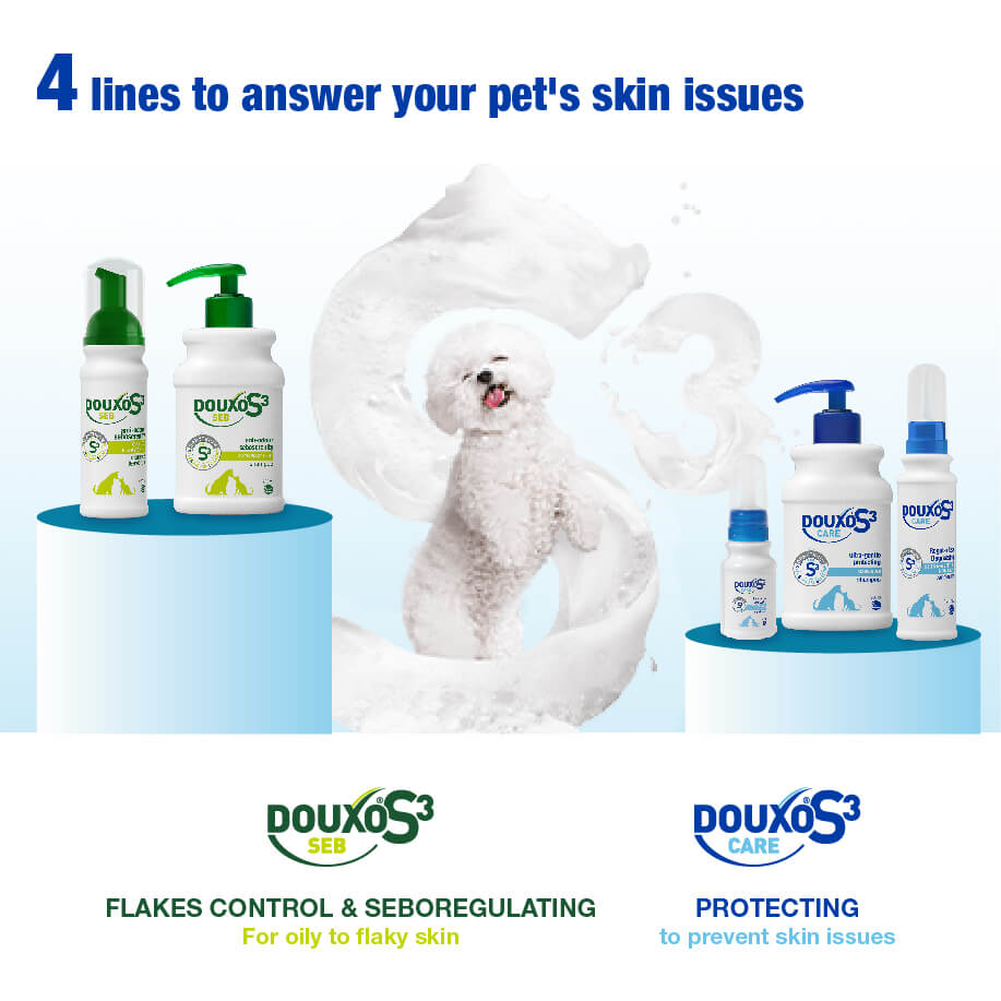 The outside world constantly challenges the ecosystem of cats and dogs skin. If the skin barrier is damaged, the natural flora is disrupted and its defences are activated, causing skin disorders. Pets’ skin is sensitive and different from human skin. Thus, it is important to use a good quality product that is formulated specifically for pets. DOUXO® S3 provides best-in-class solutions to pets facing skin issues to restore their skin health and your bond.
